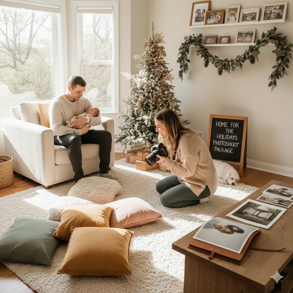 Intimate home environment photoshoot with natural lighting. Perfect for family portraits and personal moments. Includes 2-hour session and 30 edited images.